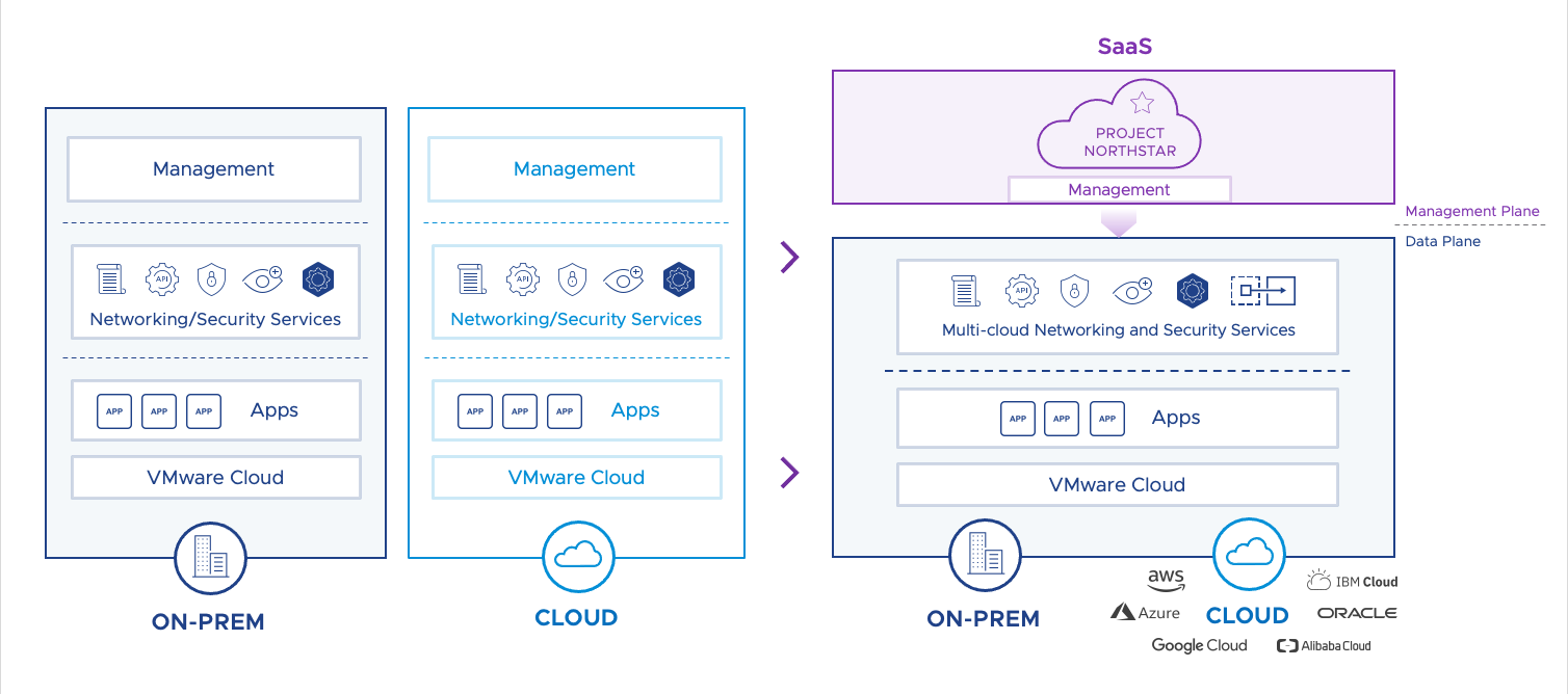 Alle oben genannten Services werden „as a Service“ von VMware verwaltet. Diese SaaS-Dienste ermöglichen konsistente Richtlinien, Abläufe und Automatisierung in Ihren Multi-Cloud-Umgebungen. Durch den Zugriff auf die Cloud-Konsole in Northstar, die von VMware bereitgestellt wird, können Sie Netzwerk-, Sicherheits- und Governance-Richtlinien auf ihre Private Cloud-, Hybrid-Cloud- und Multi-Cloud-Umgebungen anwenden.